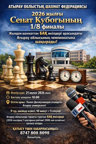 Атырау облыстық шахмат федерациясының ұйымдастыруымен 2026 жылғы Сенат Кубогының 1/8 финалы аясында жылдам шахматтан бұқаралық ақпарат құралдары өкілдері арасында Атырау облысының чемпионаты өтеді, деп хабарлайды AtyrauPress тілшісі.