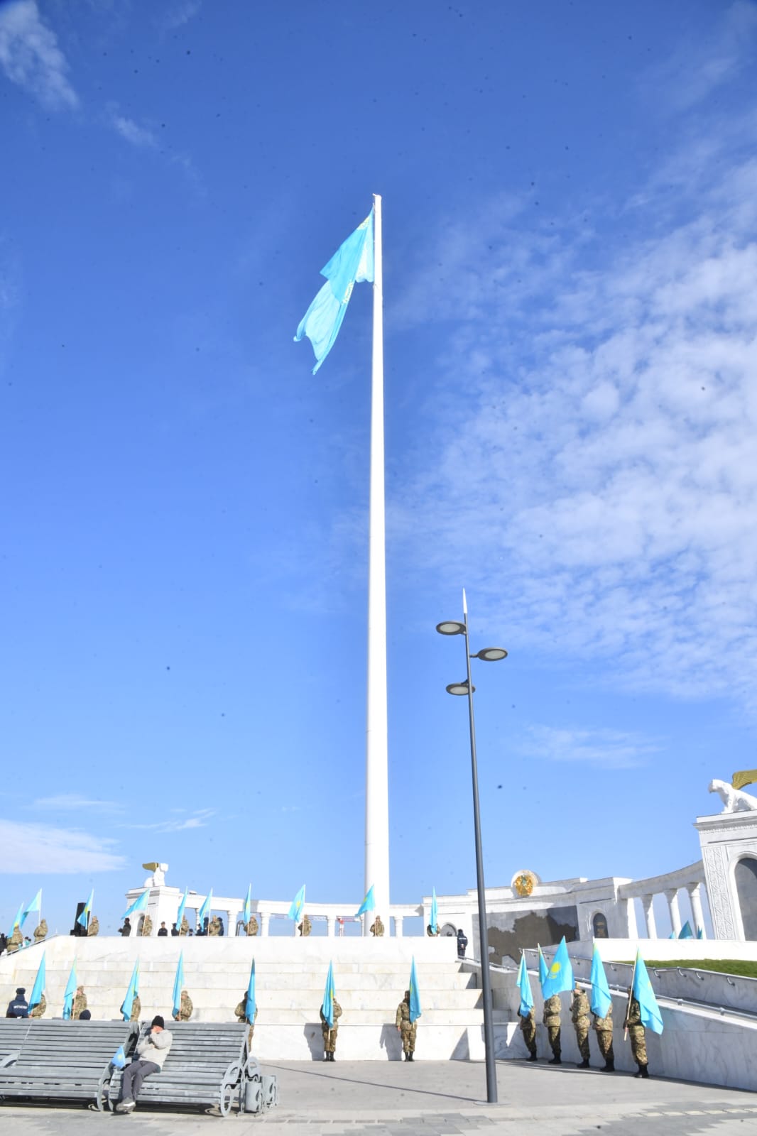 Мемлекеттік ту биіктігі 91 метр болатын тұғырға гимнді орындаумен көтеріліп, аспан астында көк байрақ желбіреді.