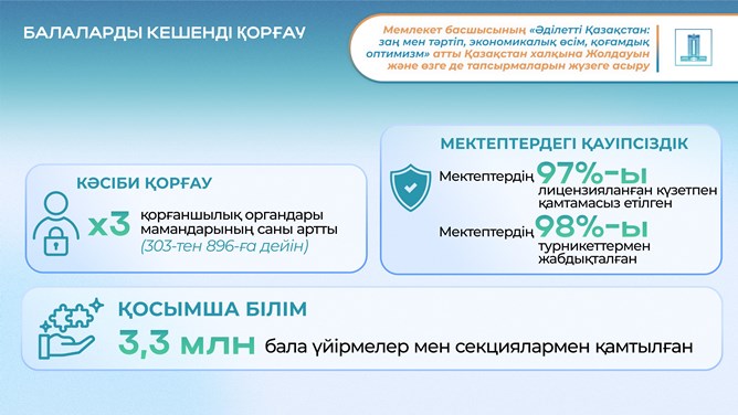 Президент тапсырмаларын орындау шеңберінде «Қазақстан балалары» мемлекеттік бағдарламасы шеңберінде «Адал азамат» бірыңғай бағдарламасы жаңартылды, ол үшін бірыңғай құндылық кеңістігін қалыптастыратын арнайы брендбук әзірленді. Сонымен бірге балалар құқықтарын қорғау шаралары күшейтілуде: қамқоршылық органдары мамандарының саны үш есеге жуық, 303-тен 896 адамға дейін ұлғайды, бұл отбасыларға уақтылы әрі білікті көмек көрсетуге мүмкіндік береді. Мектептерде буллингтің алдын алу үшін Kiva және «ДосболLIKE» халықаралық бағдарламалары енгізілуде. Физикалық қауіпсіз орта құрылуда: ұйымдардың 98%-ы турникеттермен, 97%-ы лицензияланған күзетпен, 96%-ы дабыл түймелерімен қамтылған, ал 81%-ы полицияның жедел орталықтарына қосылған.