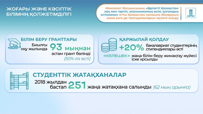 Сондай-ақ жеңілдікпен білім беру несиелері мен 300 сараланған грант бар, олардың шеңберінде мемлекет оқу құнының 50%-ын немесе 75%-ын жабады, ал студент толық көлемде стипендия алады. Білім алу үшін қолайлы жағдай жасаудың тағы бір маңызды аспектісі – баспана мәселесін шешу. Мемлекет басшысының тапсырмасына сәйкес студенттік жатақханаларда жыл сайын кемінде 10 мың орын ұйымдастыру міндеті қойылды. Бұл бағыттағы жүйелі жұмыстар бойынша қазірдің өзінде елеулі нәтижелерге қол жеткізілуде: 2018 жылдан бастап 62 мың орындық 251 жаңа жатақхана пайдалануға берілді. Ағымдағы жылы 10 мыңнан астам орындық 29 жатақхана іске қосылады, олардың ішінде ел тарихындағы ең ірі жатақхана – елордада Еуразия ұлттық университеті үшін салынған 2 656 орындық жатақхана бар. Осылайша тапшылық мәселесі еліміздің барлық өңірлерінде шешімін тапты. «Student-residence» заманауи моделі енгізілуде, ал әлеуметтік осал топтардан шыққан студенттер үшін мемлекет 2023 жылдан бері тұру шығындарын өтеп келеді.